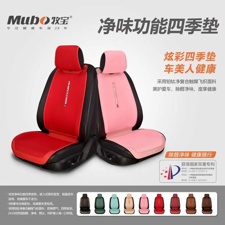 主打的牧寶凈味功能四季墊,采用運(yùn)動(dòng)品牌專用的飛織面料**用于座墊產(chǎn)品,舒爽透氣,四季皆宜;經(jīng)典9個(gè)顏色,適合各種內(nèi)飾搭配,有顏值有內(nèi)涵,座墊采用鉑鈦凈復(fù)合觸媒技術(shù),24H持續(xù)除醛、凈味、降塵。